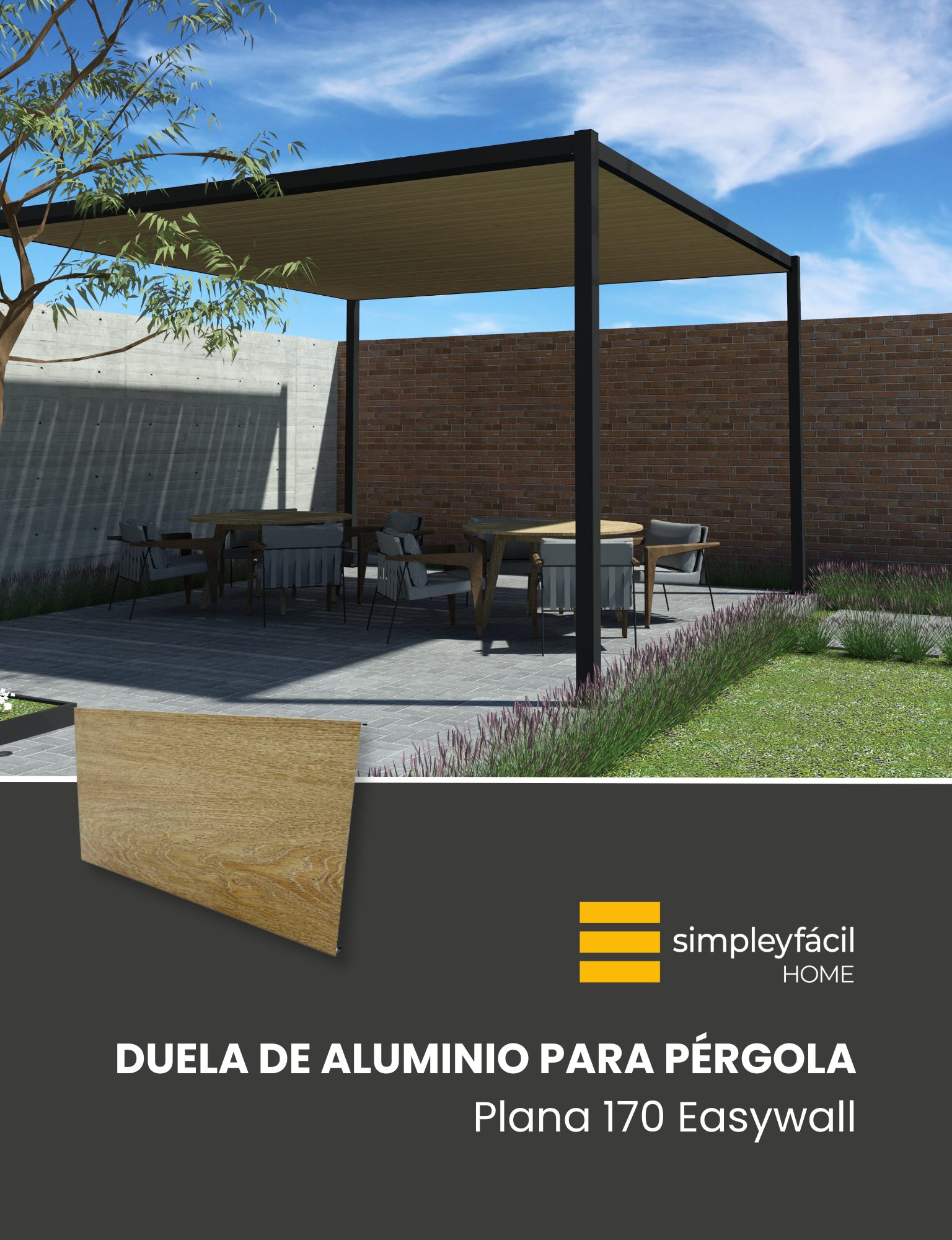 Con la duela plana de aluminio Easywall de 170 mm puedes crear pérgolas con gran cobertura, sombra y una estética robusta. Gracias a su anchura, permite construir cubiertas más cerradas que brindan una sensación de techo continuo o plafón. Su diseño permite una distancia máxima entre trabes de 1.30 metros y una separación fija entre duelas de 1.29 cm entre cada una.